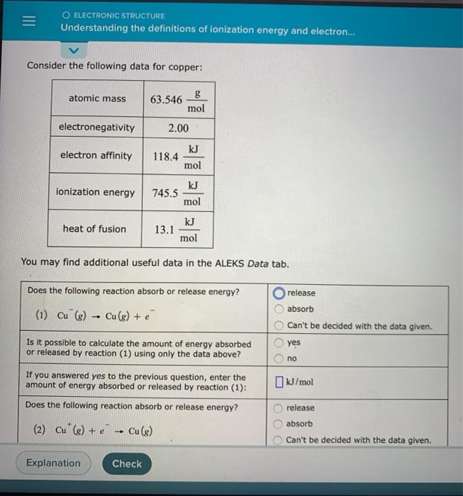 Oneclass I Www Awa Aleks Com O Electronic Structure Understanding The Definitions Of Ionization E